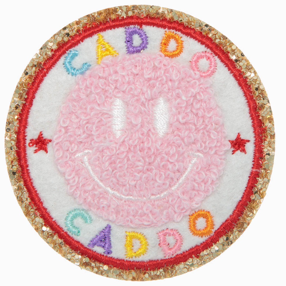 2.5" wide, embroidered stick on patch with chenille smiley face.